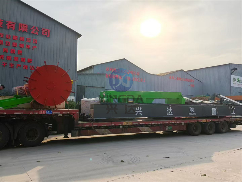 第1车粉状有机肥生产线设备完成装车准备出发前往嫩江:轮盘翻抛机通常配备轨道或轮胎,可沿发酵槽纵向移动。工作时,高速旋转的轮盘(带耙齿或刀片)切入粪堆,通过离心力抛散物料,实现翻堆与破碎一体化,同时促进氧气渗透,利于好氧微生物繁殖,加速有机肥发酵。