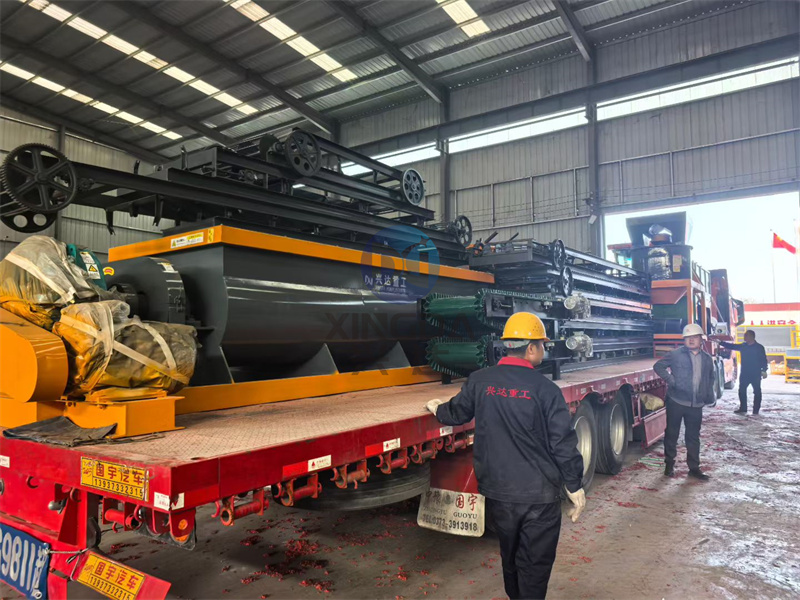 新年第一套年产万粉剂有机肥生产线设备正在装车中: 粉剂有机肥生产线的前端需要配备原料仓,用于储存有机废弃物、农业废弃物等原料。这些原料将成为后续生产有机肥料的基料。粉剂有机肥生产线的中间环节包含搅拌、发酵、熟化等环节,这些环节能够有效促使原料中的有机质、水分、营养成分等进行充分混合,达到发