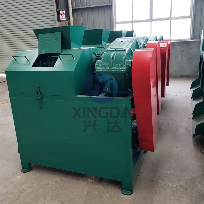 这款兴达公司制作的对辊式造粒机采用物理挤压原理,将粉剂物料加工为所需形状颗粒,其工作原理是:由电动机驱动皮带和 皮带轮,通过减速机传递给主动轴,并通过对开式齿轮与被动轴同步,相向工作。物料从进料斗加入,经对辊挤压成 型,脱模造球,然后落入破碎室,同时随着传动轴驱动的一副链条带动两根狼牙棒的旋转,将挤压成型但相互粘连的 颗粒分离,从下方筛孔筛下成品颗粒和粉料,经过后续的筛分机实现颗粒物料和回料粉剂的分离,利用皮带输送 机使返回料与新料混合,再次进行造粒。随着电动机连续转动,物料的不断进入,实现了批量生产。