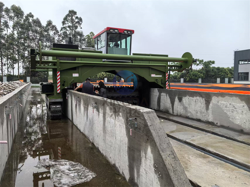 试机现场:完成安装的米宽的液压履带覆膜翻抛机正在试机: 液压履带覆膜翻抛机是一种利用液压系统驱动履带行走,同时进行覆膜和翻抛作业的农业机械。它通过履带的运动带动机器前进,液压系统提供动力,使翻抛装置能够有效地将土壤或有机物料翻转并覆盖上一层薄膜。这种设备广泛应用于农田管理、堆肥处理以及土壤
