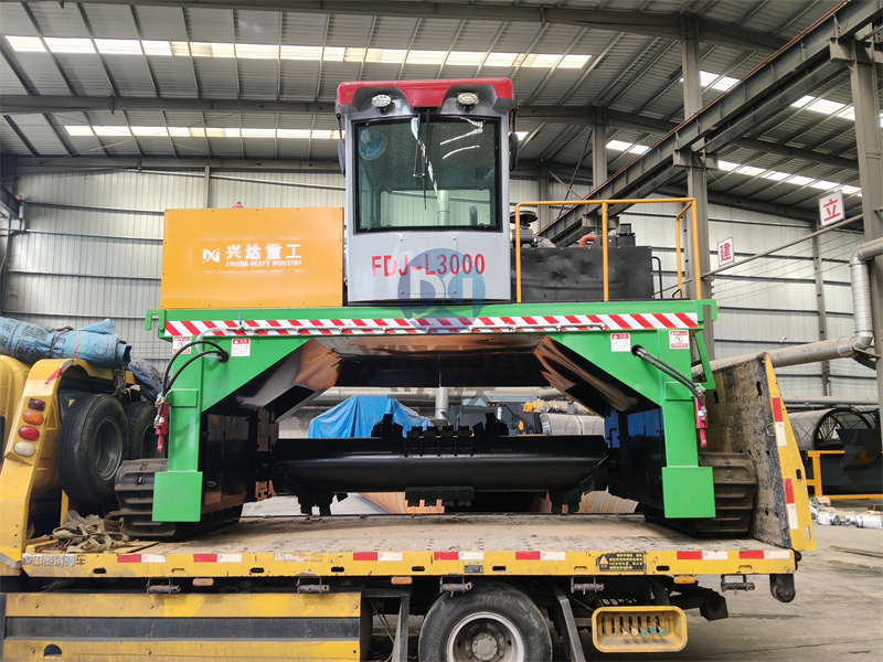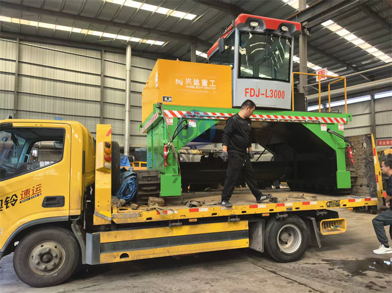 一车准备发往大同的有机肥履带翻抛机准备出发:履带翻堆机采用履带行走占地少、转弯灵活、可以原地掉头、提高物料堆放场地利用率。机器整体结构合理,整机刚性好、受力平衡、简明、结实、易操控、对场地适用性强,除粗壮的机架,零部件均为标准件,使用维护方便。行驶中整车骑跨在预先堆置的长条形肥基上,由机架下挂装的旋转刀轴对肥基原料实施翻拌、蓬松、移堆,车过之后成新的条形垛堆。在翻抛过程中,物料被高速旋转的滚筒带起并向后移动一定的距离所以在翻抛过程中,翻抛机可对物料打散、粉碎,并带走部分水分。